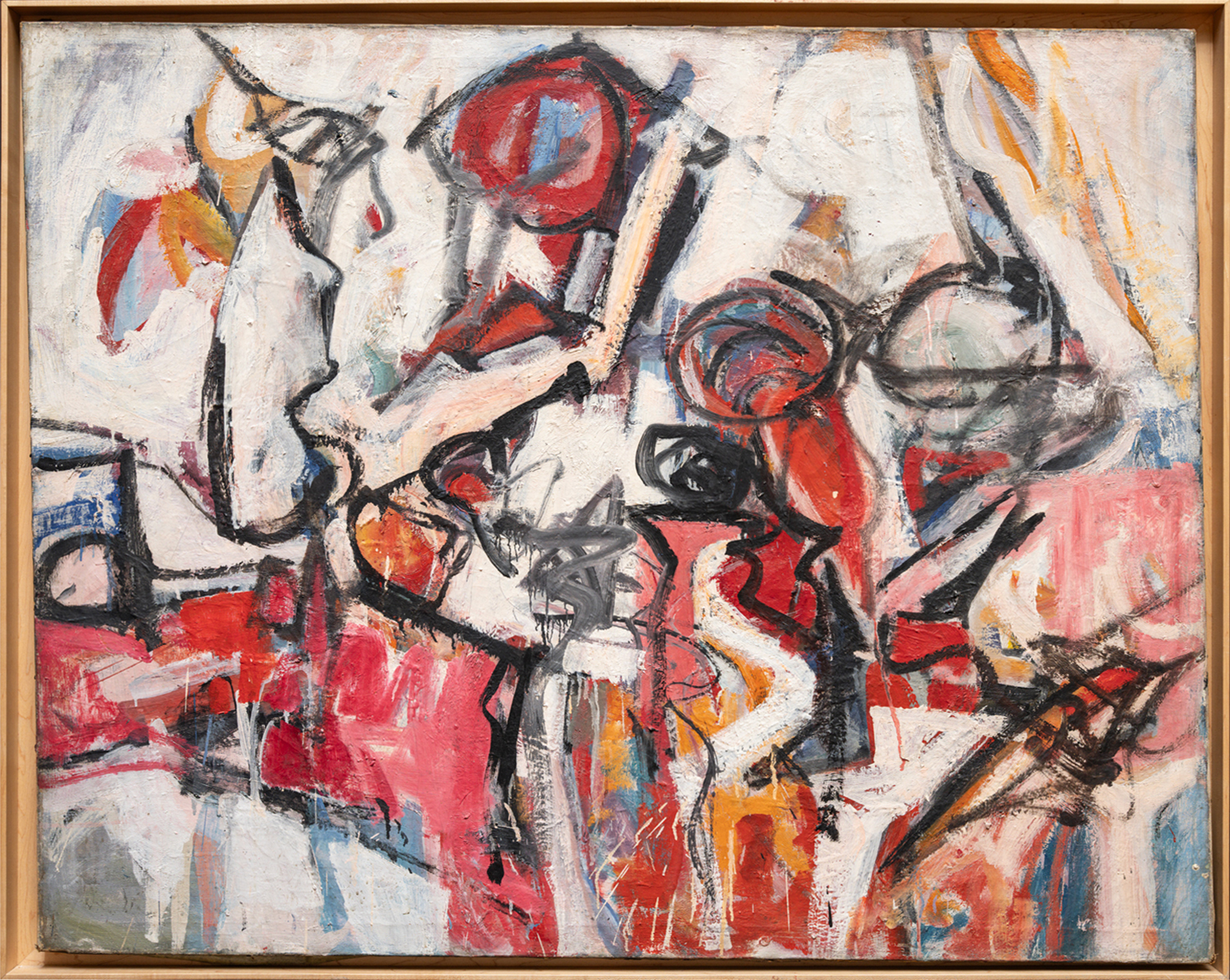 By 1950, Joann Gedney moved to 49 East 10th Street at the center of the New York School Abstract Expressionist world in New York. She frequented the Cedar Tavern and was heavily involved with The Club, all in the neighborhood South of Union Square. There she developed relationships with influential artists like Franz Kline. While she is left out of male-dominated narratives of the Abstract Expressionist movement, her involvement, independence, and influence are well documented. Gedney’s paintings are composed of gestural brushstrokes, bold lines, and structural blocks of color. While her work is decidedly abstract, representation of the human figure and landscape is alluded to throughout her work. These paintings attest to her fascination with the expressive power of the human face and body. From her arrival in New York in 1947 until her death in 2013, Gedney continuously made art and was a fixture in the Village.